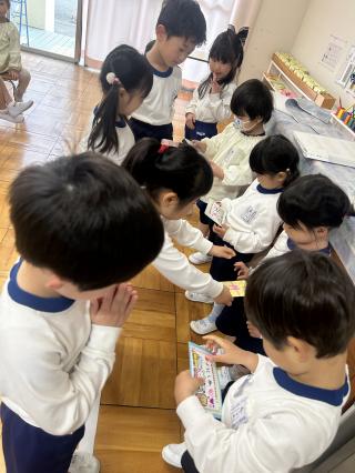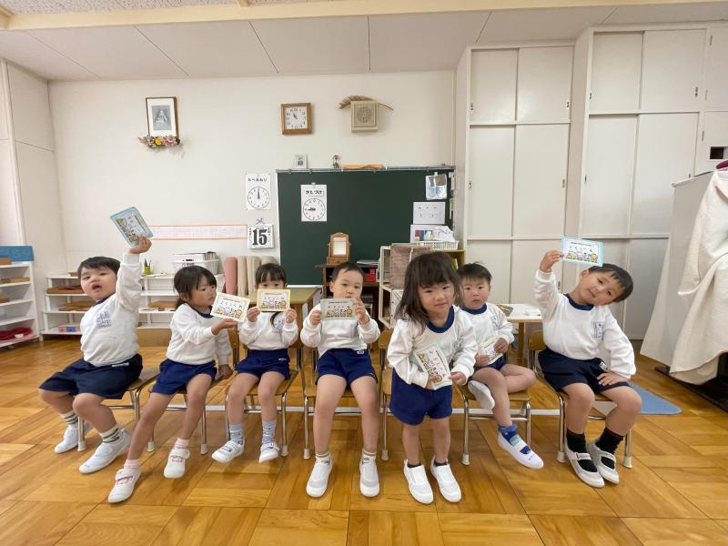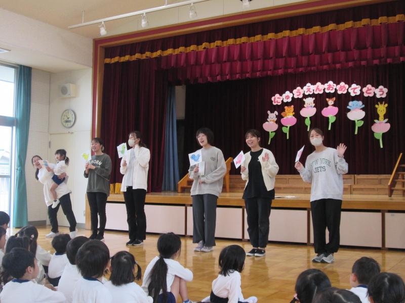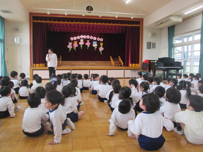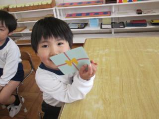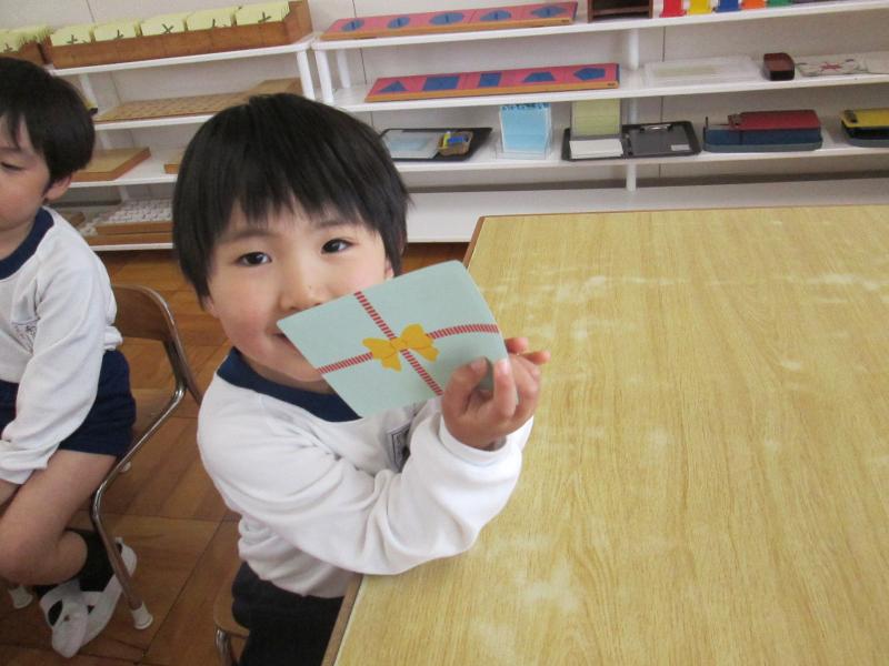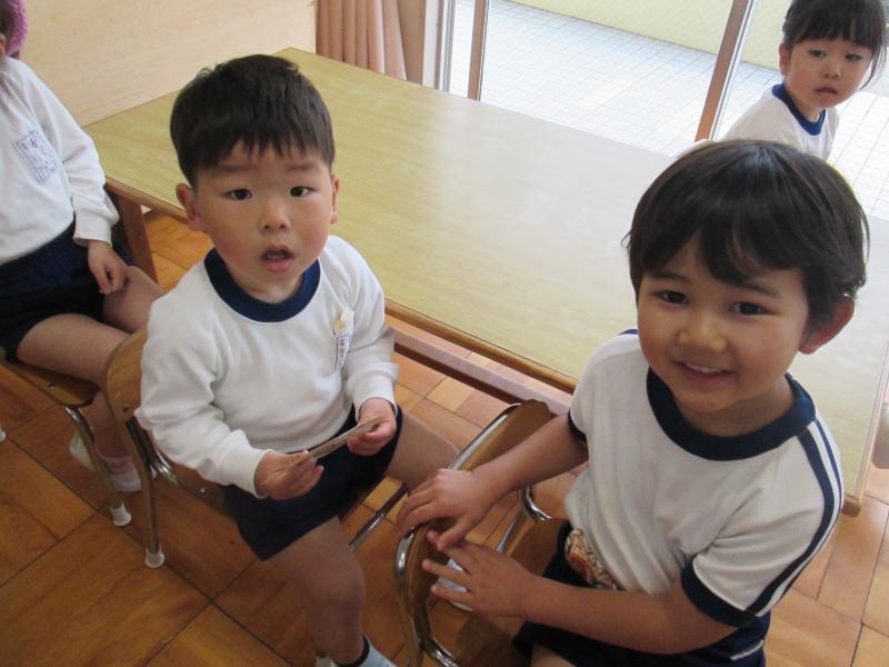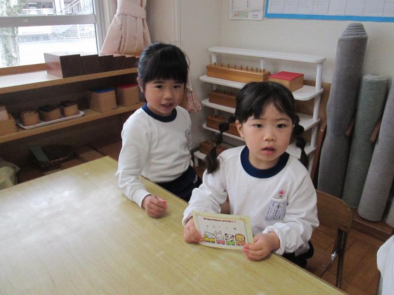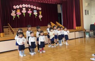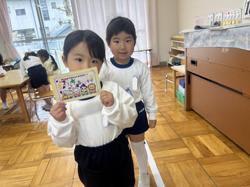 クラスごとにペアのAさんに連れられてCさんが前にでて顔を見せてもらいました。ドキドキしながら前に出るこ、笑顔いっぱいの子など様々でしたが、全員前に出ることができました。最後にクラスの先生たちが「小鳥たちは」「チューリップ」「幼稚園の歌」を披露しました。子ども達のリクエストで急遽「小鳥の歌」も歌い、楽しい会となりました。クラスに戻り、「これからよろしくね」とAさんや先生にカードのプレゼントをもらいました。