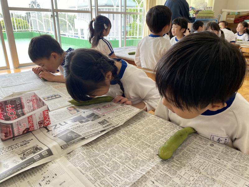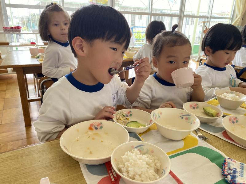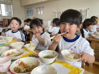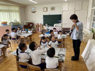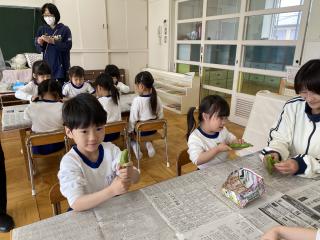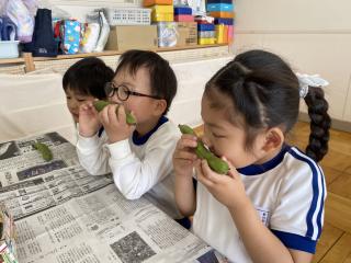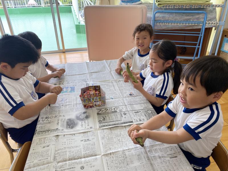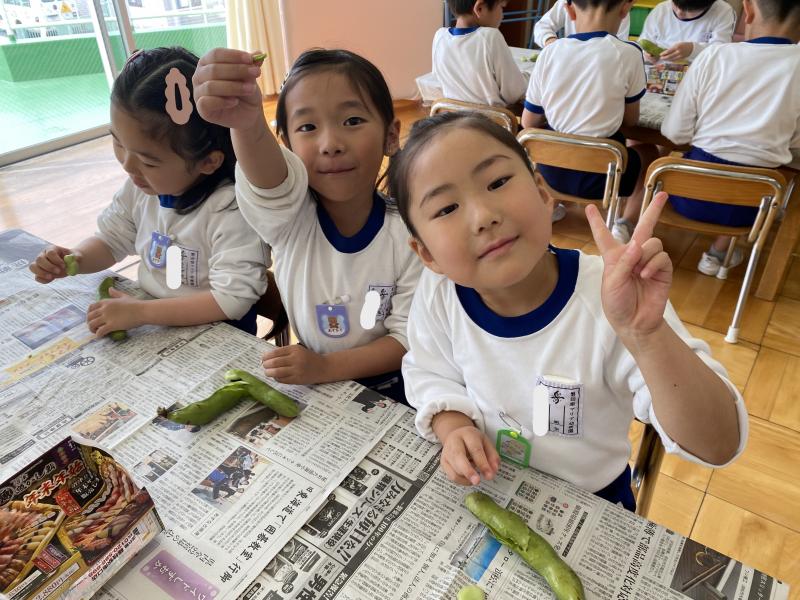 実際にそら豆の豆だしに挑戦すると「ベッドみたい!」「ふかふかだ~」と目を輝かせながらそっと豆を取り出す子どもたちの姿がありました。豆出しの後にはそら豆の名前の由来や食べ方のお話を聞きました。そして今日の給食には、子どもたちが出したそら豆がでてきました。「私たちが豆出ししたそら豆だ!」「もっと食べたい」と喜び、嬉しそうに給食を食べる姿が見られました。
