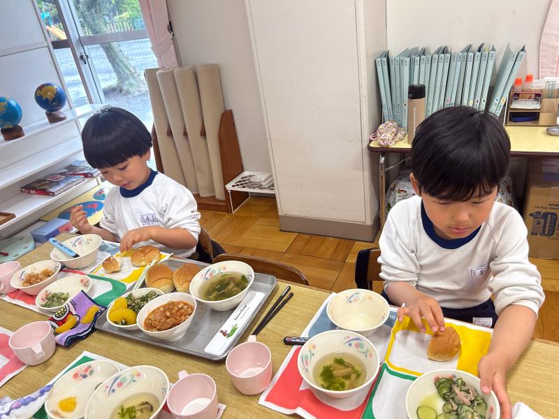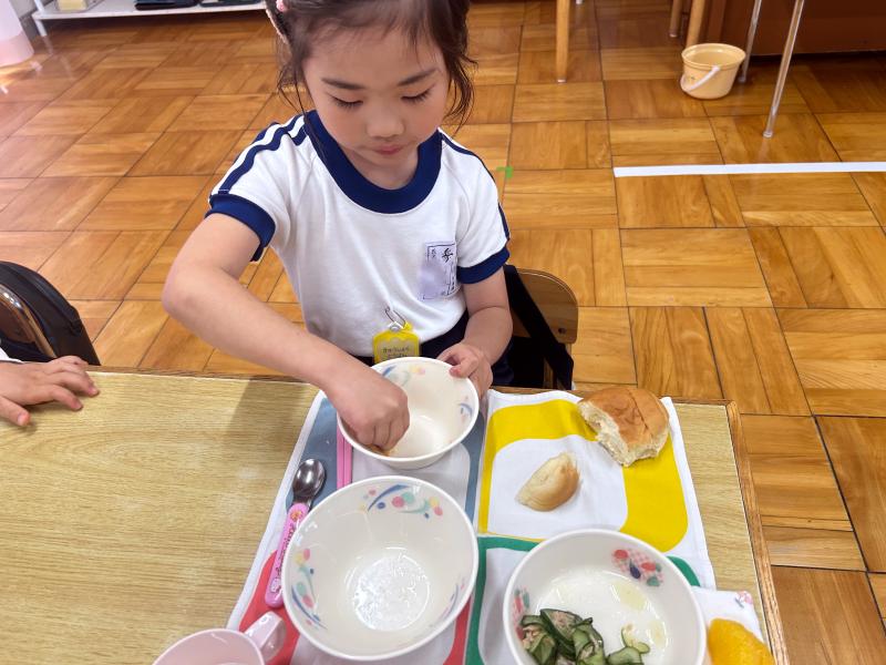 AさんやBさんはCさんの口に運ぶお手伝いをする姿、お皿に残っているものを集めてあげる姿、ぴかぴかパン(食器の汚れをパンで拭いて綺麗にすること)の仕方を教えてあげる姿等、給食中でも優しい気持ちで年下の子に接する様子が見られ、縦割りの良さを沢山感じることができます。