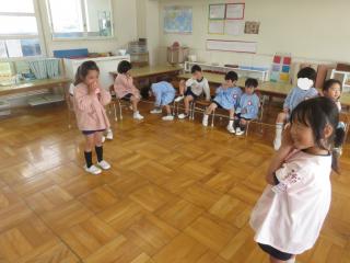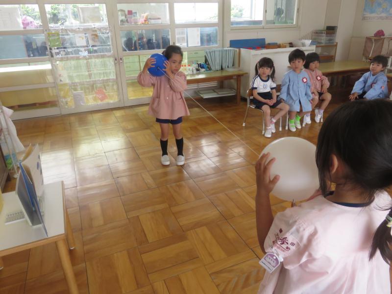 始めに風船と風船をたこ糸でつないで友達の声が聞こえるかを体験しました。