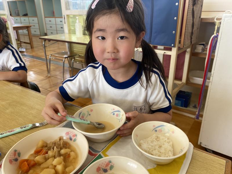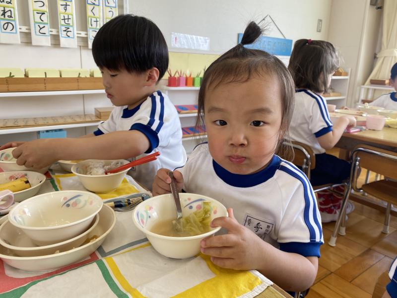 給食の時間、みそ汁の中にBさんがちぎったキャベツが入っているよと伝えると残さず食べていました。