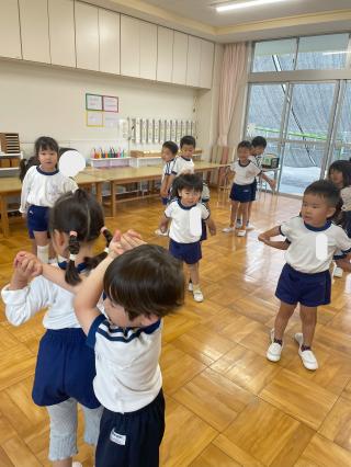 わらべうたは、日本の伝統の一つです。数え歌、絵描き歌、子守歌、遊び歌など様々な種類があります。その中でも友達と一緒に行う、遊び歌は身体を使って友達と一緒に楽しむことで思考力だけでなく、社会性も身に付きます。子ども達同士の関わりが増えてきた今、積極的に取り入れていきたいと思います。ぜひ、ご家庭でも家族みんなで楽しんでみてください!