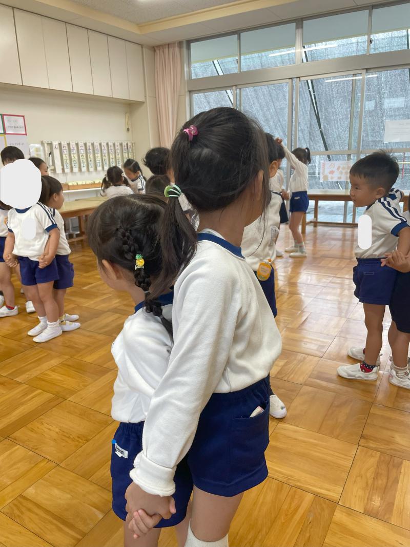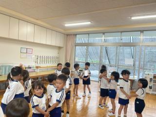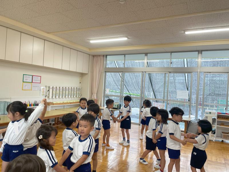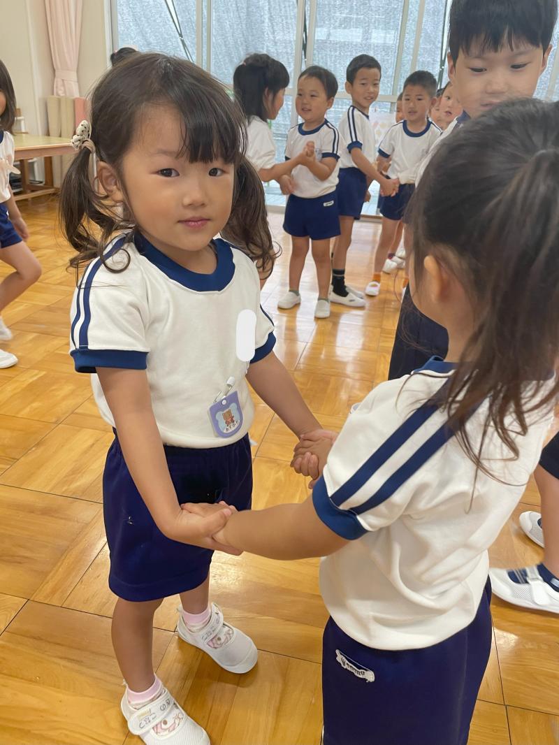 Cさんが園生活に慣れてきたこともあり、少しずつクラスの友だちとの関わりが増えてきたこの頃。クラスで「なべなべそこぬけ」を行いました。まずは2人組。ペアとは違う友達と手を繋ぎ少し緊張する姿、ペアがなかなか見つからないと困っている子に「一緒にしよう」と手を差し伸べる優しい姿が見られました。よく知っているAさんがお手本となり、みんなに見せると「知ってる‼」、「できるよ‼」と声があがりました。2人組はコツを掴むとすぐにできるようになりました。顔が向き合った状態から、身体が背中合わせになる動きに驚くCさんの姿がありました。Cさん同士でペアになって行うところもあり、とても可愛らしかったです。