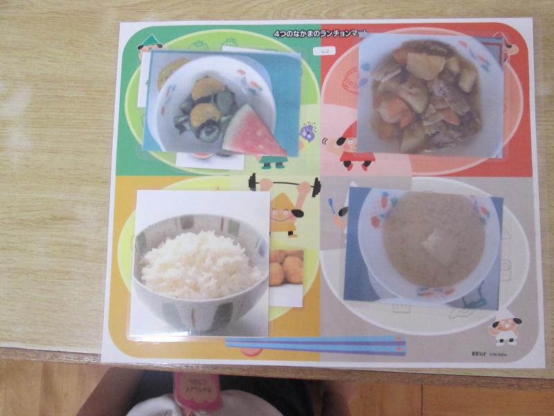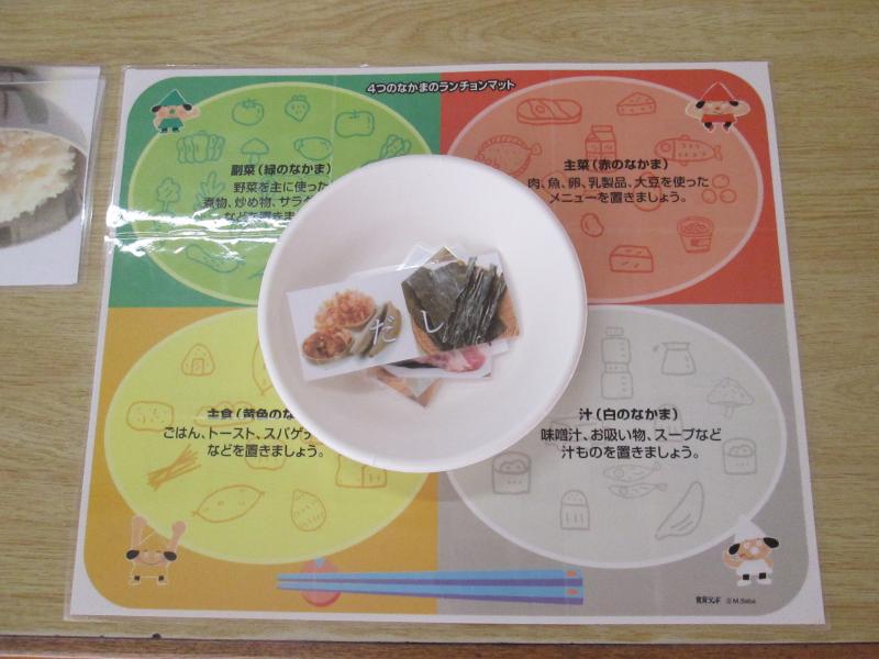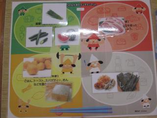 一人一枚4つの色のランチョンマットを机に敷き、今日の給食のメニューを見ながら食べ物カードをランチョンマットにおいていきました。