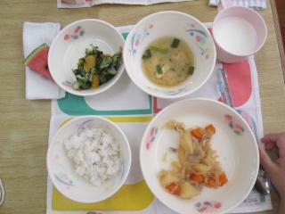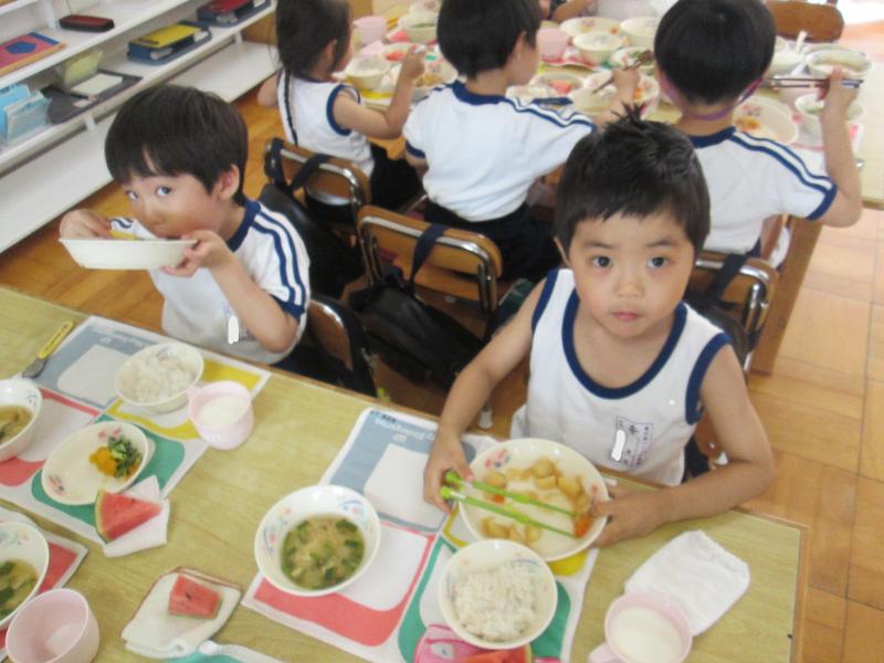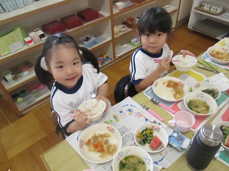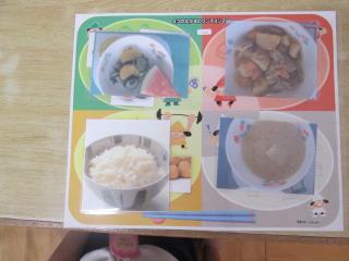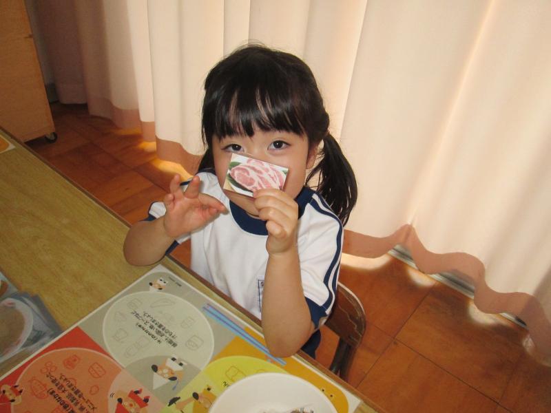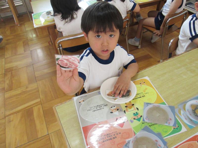 豚肉だったら赤のお部屋、きゅうりだったら緑のお部屋というように自分で考えながらカードをおいていきました。6月に食育劇を見たというこもあり、どの子も4つの栄養を理解して活動している姿がありました。今日の赤のメニューは「にくじゃが」でした。じゃがいものカードを赤の部屋においている子がたくさんいましたが、実はじゃがいもは「黄色のお部屋」。赤のお部屋にお手伝いに行っているんだよとたかこ先生に教えていただきました。「お父さん、お母さんにも教えてあげるんだ!」と張り切っている子もいました。Aさんの分類当番に向けても良い経験になったと思います。