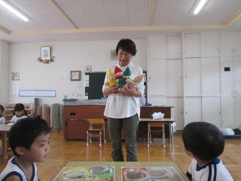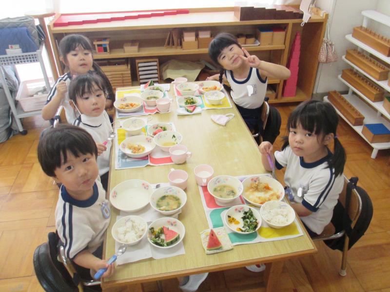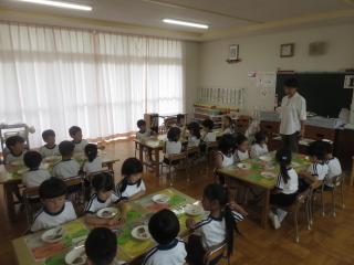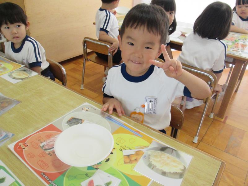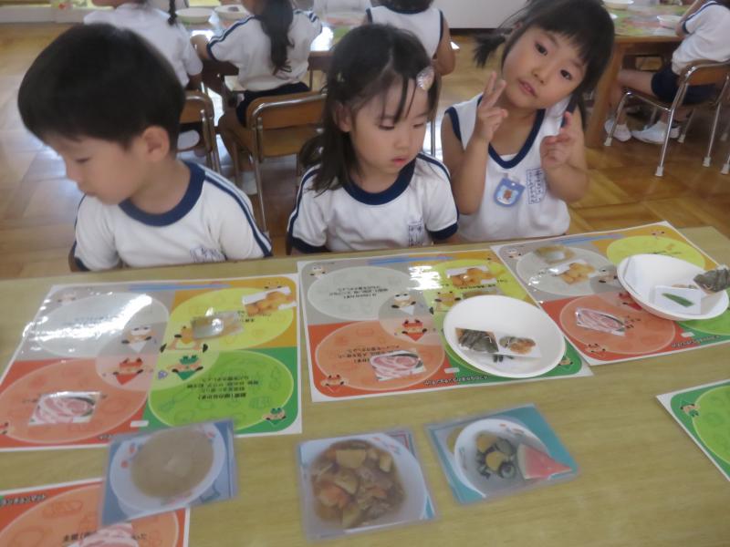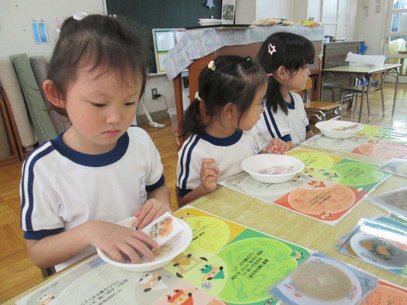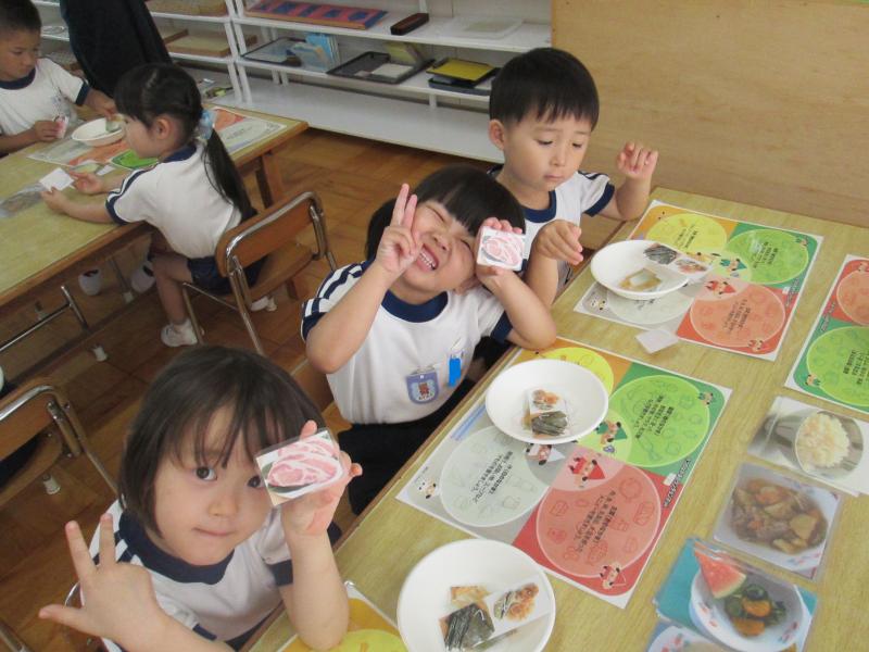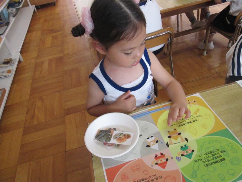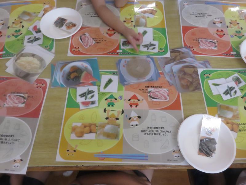 今日はたかこ先生の食育指導がありました。テーマは「食べ物カードを使って料理の名前と料理のバランスを覚える」でした。