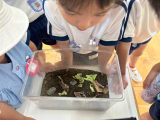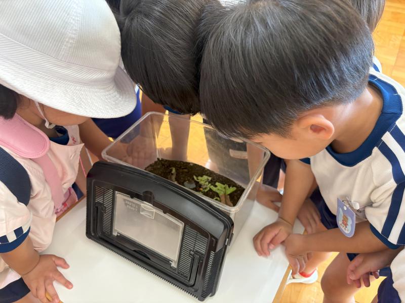 観察していて分かったことを発表してもらうと、「土が深いとどんどん潜っていく」「いつえさを食べているのかな」「枯葉やキャベツのすじは残っているから硬くて食べにくいのかも」「花びらはすぐになくなったから美味しいのかも」とたくさんの気付きがありました。