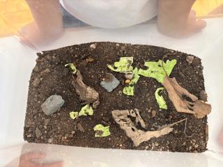 恥ずかしがり屋さんのダンゴムシたちは土に潜っていてなかなか姿を見せてくれないのですが、日に日に小さくなっていくキャベツを見て「食べてる!」と気付き、生きていることを実感しました。
