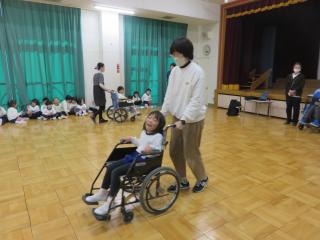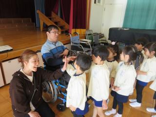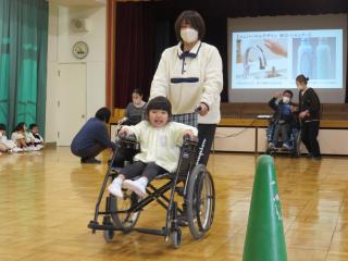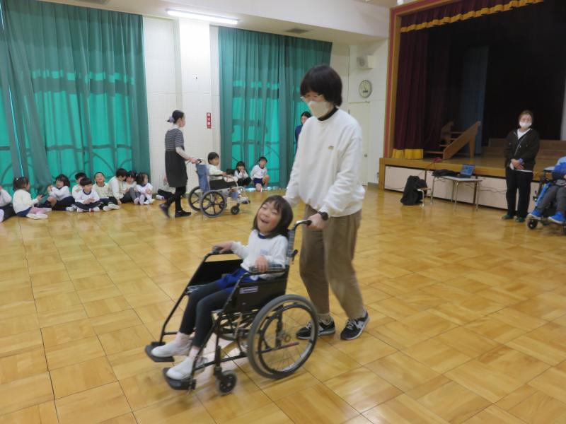 その後は、車いすの乗車体験をしました。幼児期にこのような福祉体験をすることでインクルーシブ・助け合いが広がっていくことを願いながら今後も幼児教育と福祉の関係性を強くしていきたいと思いました。