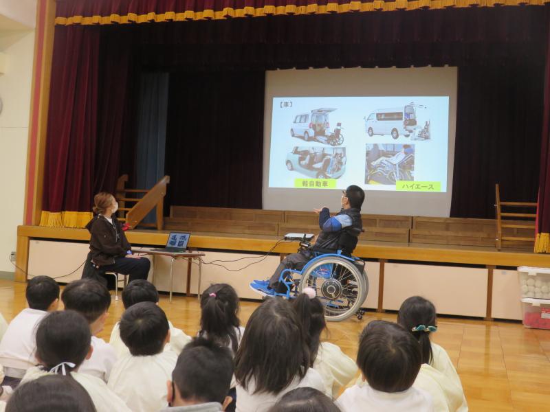 映像を使い車いす生活のことやバリアフリーのお話を子どもたちにわかりやすくしてくださいました。