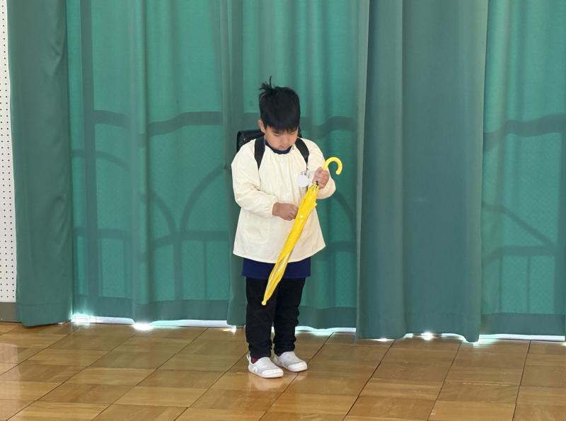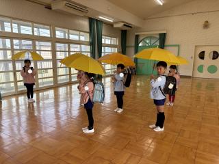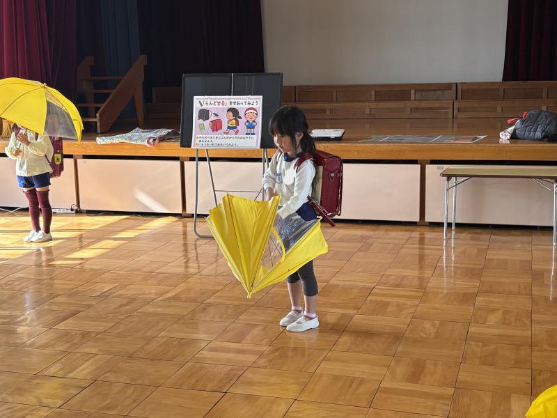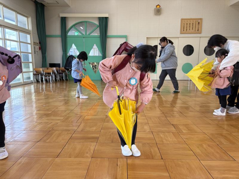 ランドセルを背負い、傘をさして歩く練習もしました。傘を持ち運ぶときは下に向けること、人がいない所に向けて開閉すること、肩にかけずまっすぐ上に向けて両手で柄を持つこと、道路を渡る時は傘を少し上げて周りをよく見えるようにすることを教えて頂きました。傘の巻き方についても教えて頂きました。足に先をはさみ、紐を掴んで、もう片方の手で柄を掴んで巻くという方法です。片手で柄を回すのが難しい子が多かったので、お家でも練習してみると良いですね!