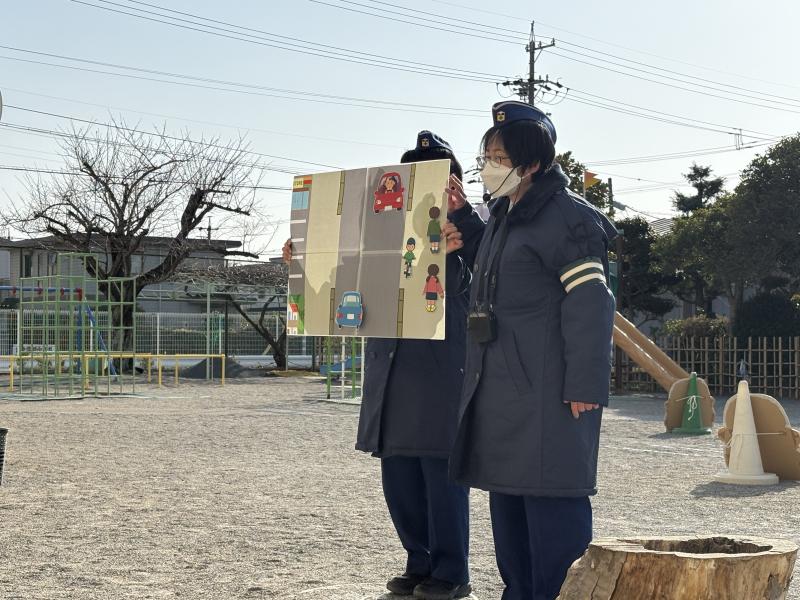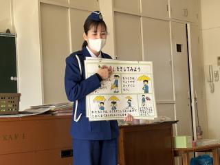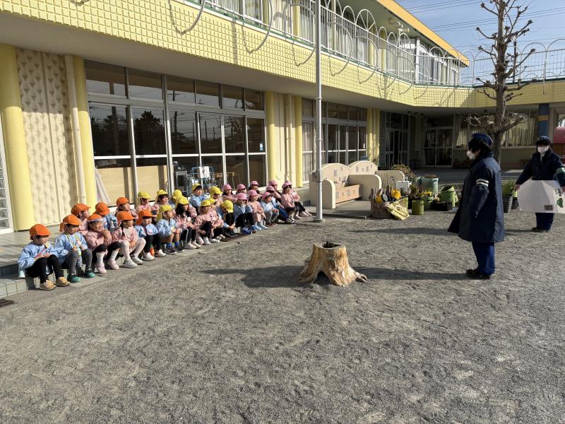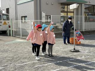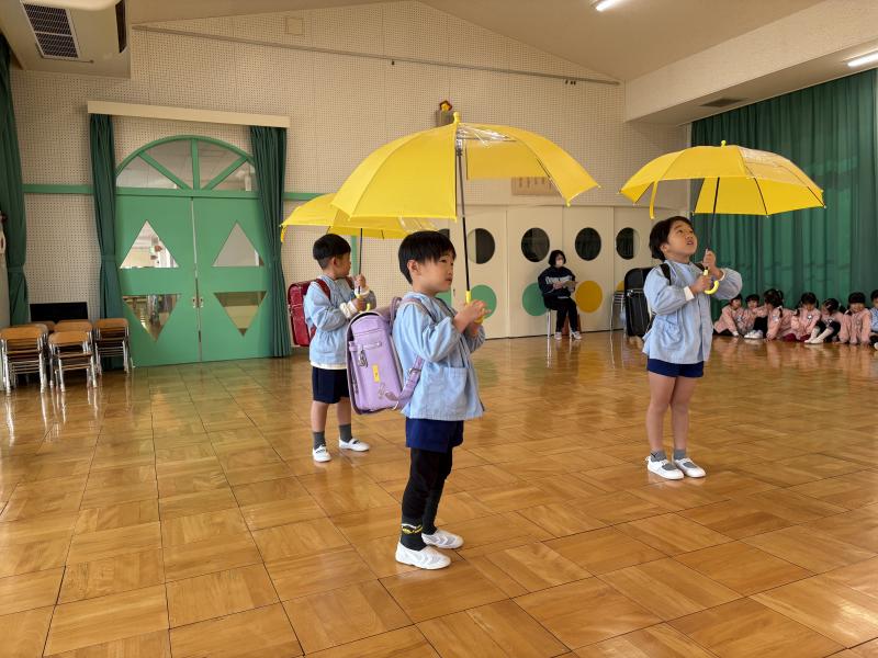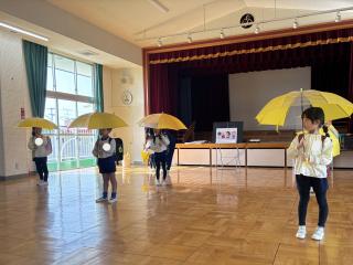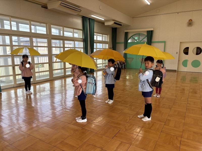 交通指導員さんから今まで教わったことの振り返りと、小学校通学に向けて傘の扱いについて教えて頂きました。