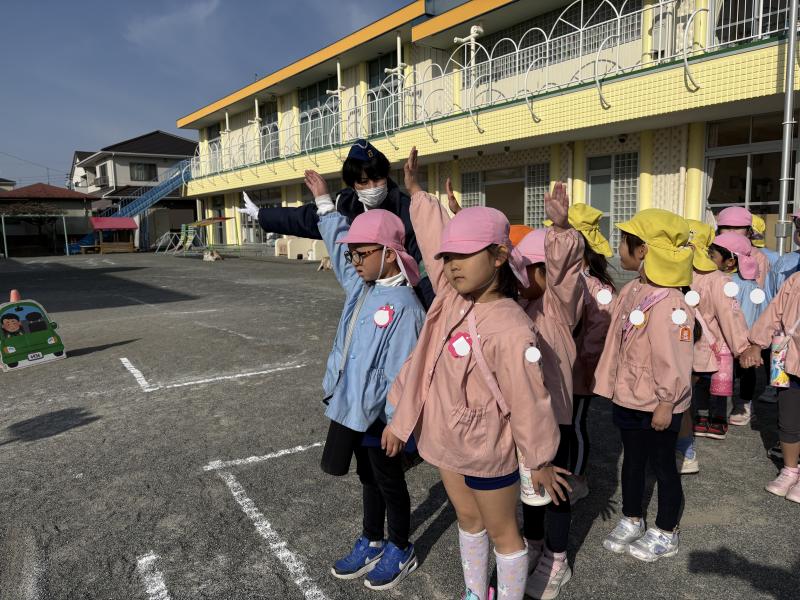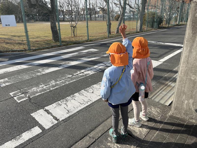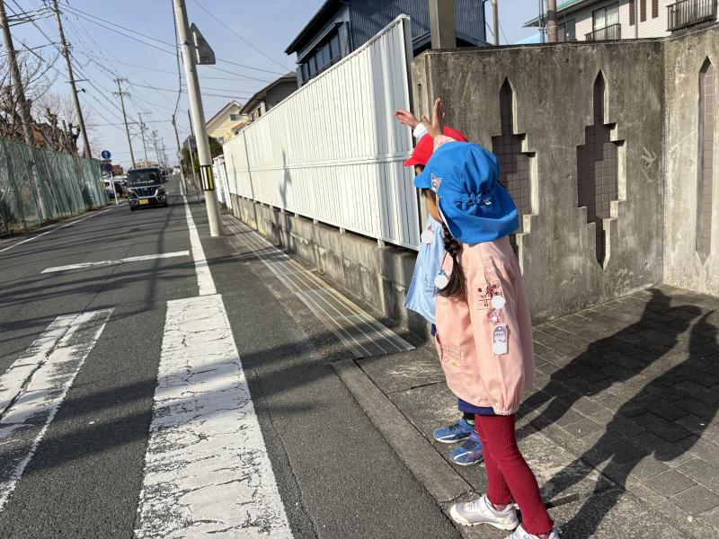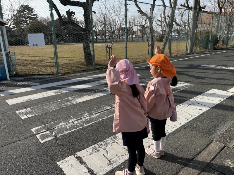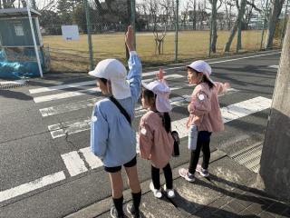 歩道を歩くときは、線から遠い所を歩くこと、横断歩道を渡る時は前後左右確認してから渡ること、止まってくれた車にはお礼を伝えることを確認しました。車が止まってくれた時にいつ渡り始めたら良いか分からない子がほとんどでした。子ども達には車が止まったことを確認したらすぐに渡り始め、渡り終えたらお礼をするように伝えました。経験を重ねて身に着けられると良いですね。