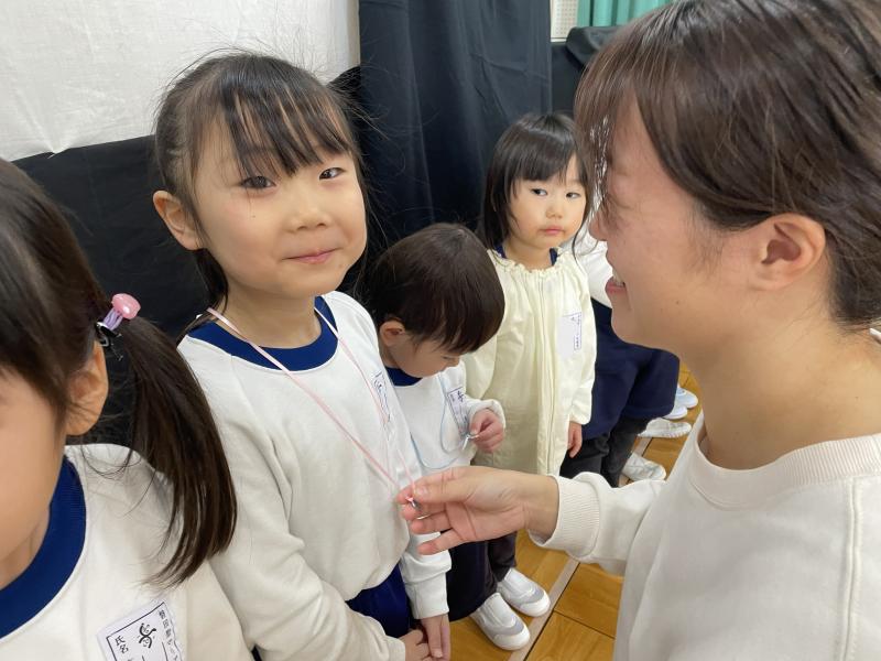 お誕生日の子どもたちは神父様に祝福していただいたおメダイを担任の先生にかけてもらうと