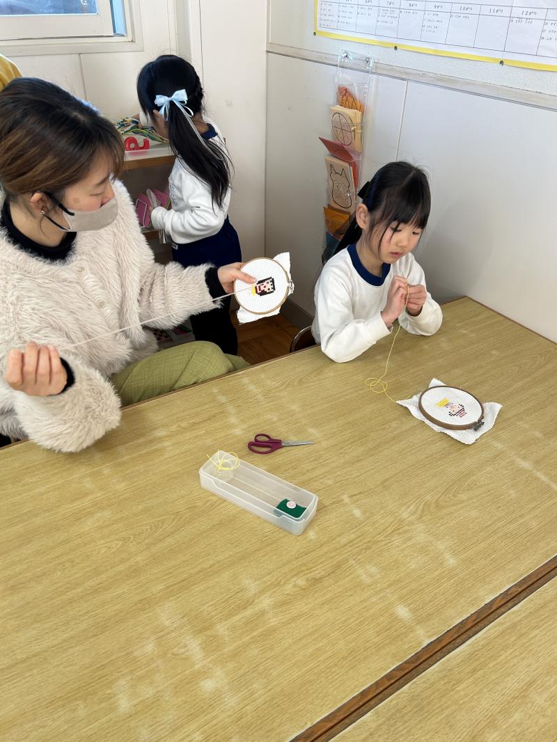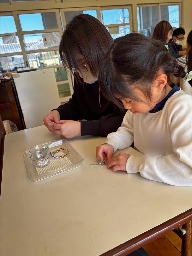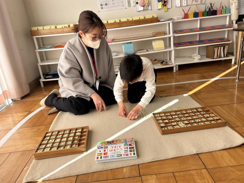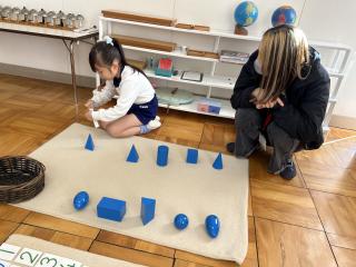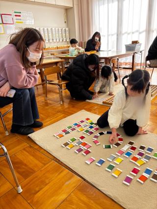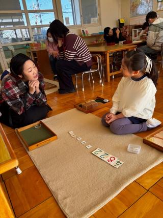 登園するといつもと違う幼稚園に少し緊張している子もいましたが、支度を済ませると保護者の方にお仕事を先生役になって教える姿や、日々取り組んでいるお仕事を一緒にする姿など親子で活動を楽しむ様子が見られました。保護者の方からも「普段子どもたちがしているお仕事を体験することができて楽しかったです」という声を聞くことができました。