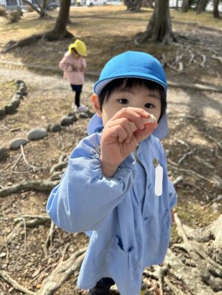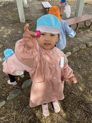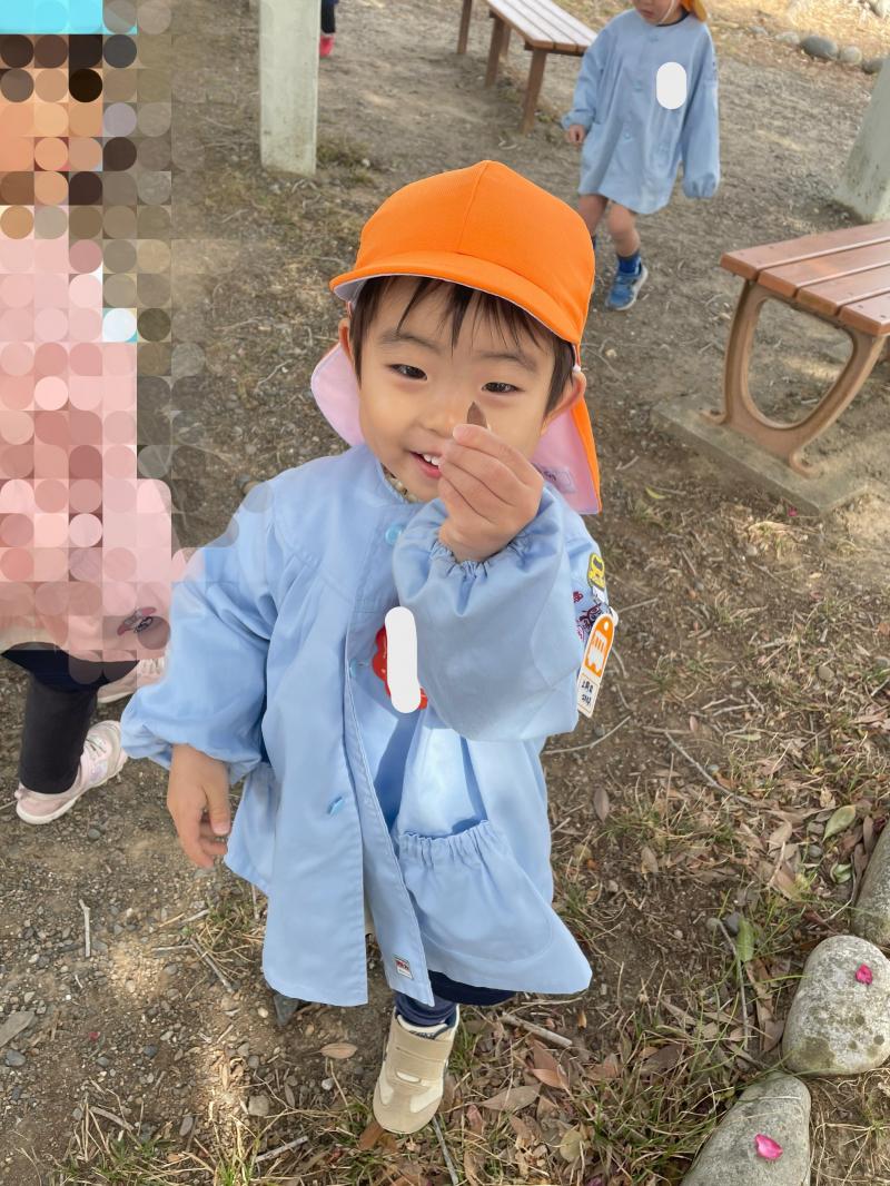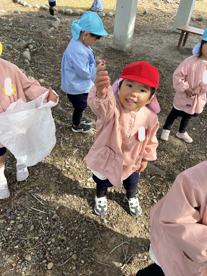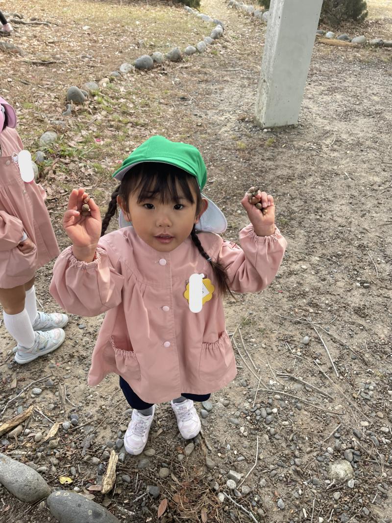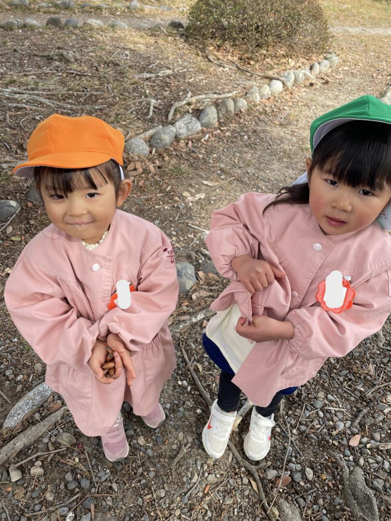 曇り空でしたが、暖かく過ごしやすい日となりました。今日は久しぶりに公園に行ってきました。子ども達は遊具で遊ぶ姿やどんぐりやまつぼっくりなどの木の実や花びらを見つけて喜ぶ姿がありました。今日 拾ったどんぐりは2学期に行った時に拾ったどんぐりと違い、ピカピカでつるつるしているものが多く、子ども達も「つるつるだ!」、「きれいなどんぐり!」、「あかちゃんどんぐりもあるよ!」と嬉しそうにたくさん報告してくれました。お土産でポケットいっぱいにどんぐりやまつぼっくりを持ち帰る子もいました。
