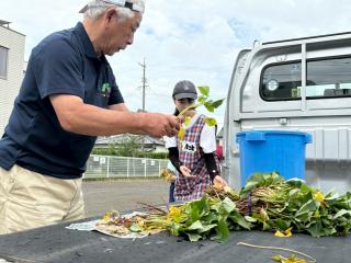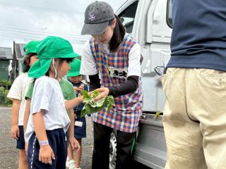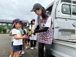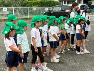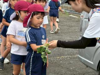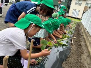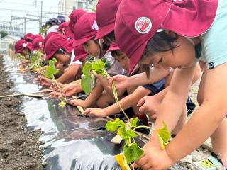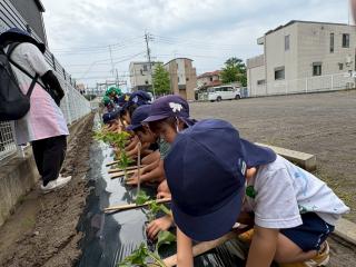 さつまいも苗植え 上手に植えました! 松永さんのお話を聞きます。 これがさつまいもの苗だよ! 大事に持ってね。 丁寧に分けてくれます。 実習生さんに苗をもらいます! 大切にもってね! ありがとう!もちゃんと聞こえました。 穴を自分であけます! 土を少し掘って苗を入れます! やさしく土のお布団かけたかな。 大きな苗をもらいました。 よくお話を聞くよ! 真剣に聞いている子発見♪ さつまいもはどうやって植えるんだろう? 大きくなーれ!と願いながら。 秋が楽しみだね♪