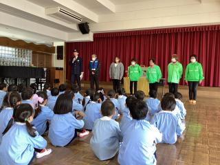 くま組さんとぞう組さんが防犯教室を行いました。沼津警察署の生活安心課の皆さんが来てくださり、紙芝居を読んでもらったり「いかのおすし」を教えてもらったりしました。実際に不審者から逃げる方法も体験しました。「たすけて~」と大きな声を出して走って逃げます。最後はみんなで「いかのおすし」のダンスを楽しく踊りました。4月からは小学生。自分で歩いて登下校するみんな。教わったことをしっかりと覚えて、安全に学校に通ってくださいね。