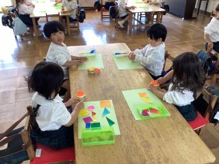 年少さんは、「いろいろなかたち」で制作帳にのりを使って、〇や△、▢などを貼りました。