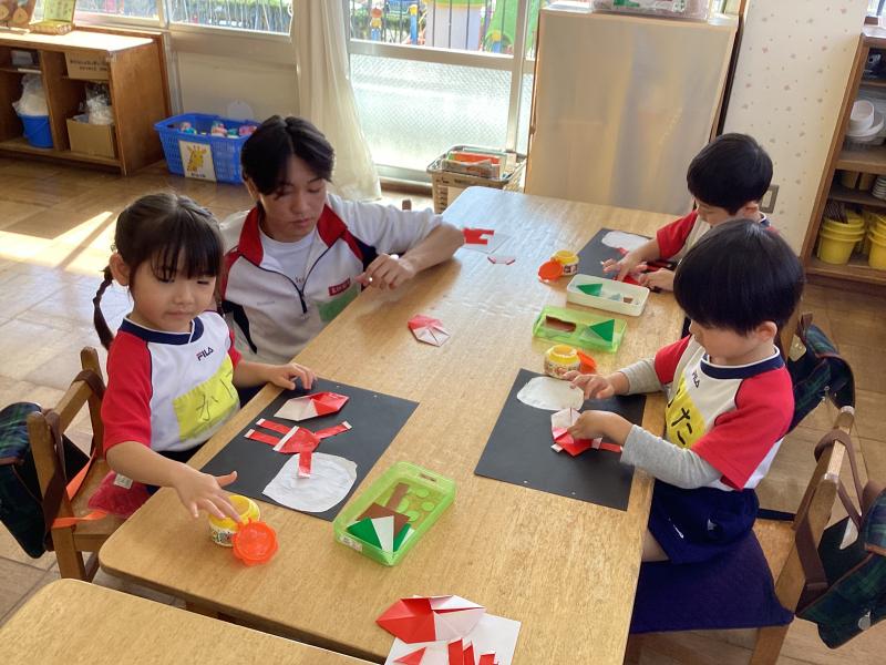 高校生のお兄さんお姉さんと一緒に制作帳を頑張りました!今日は折り紙を折ったり切ったりしてサンタクロースを作りました♪