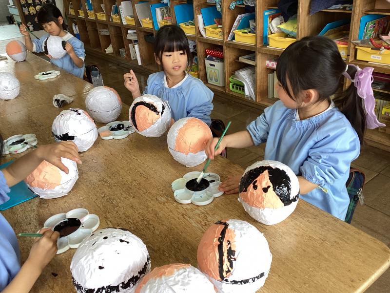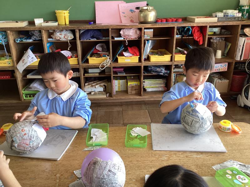 風船の上に新聞紙・コピー紙を糊でペタペタ貼っています!何ができるかな?