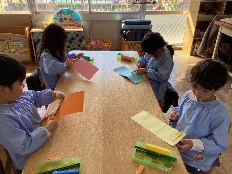 お花作りです!今日はハサミで細く切って一つ目のお花を作りました!