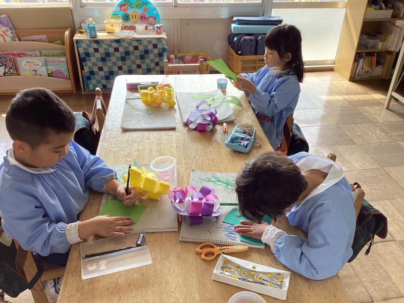 折り紙を細く切ってから丸くして花を表現!葉っぱも自分で作ります。