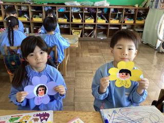 「できたー!」花びらや茎を貼って、お花の壁面を作ったよ♡