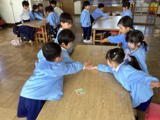 •  カルタ遊びです!先生の読んだ札を探して素早く取ります!!