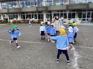 •  戸外では、年長組さんのようにバトンを持ってリレーにも挑戦したよ!!