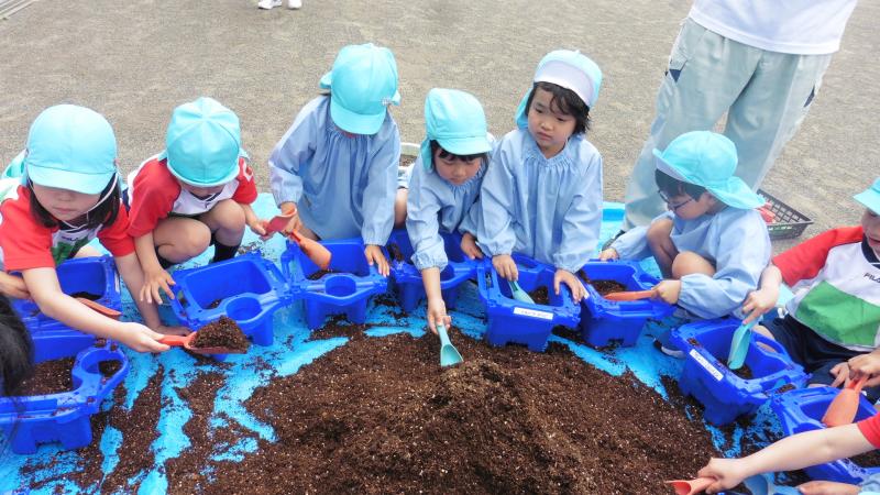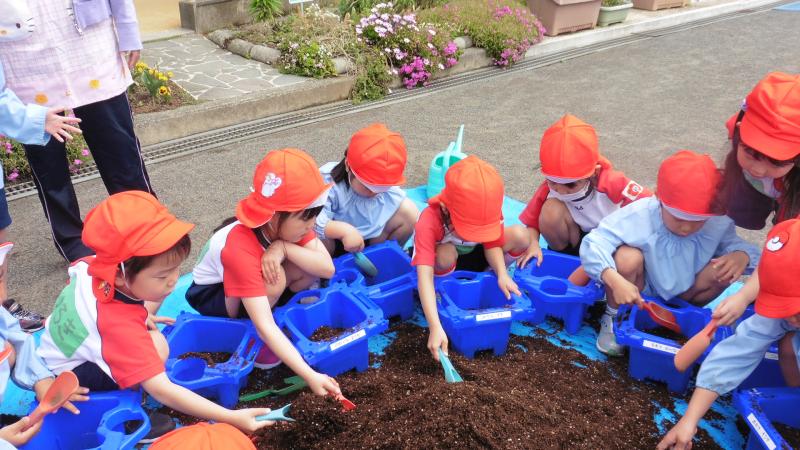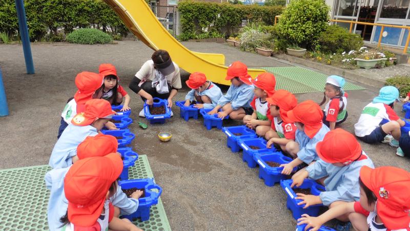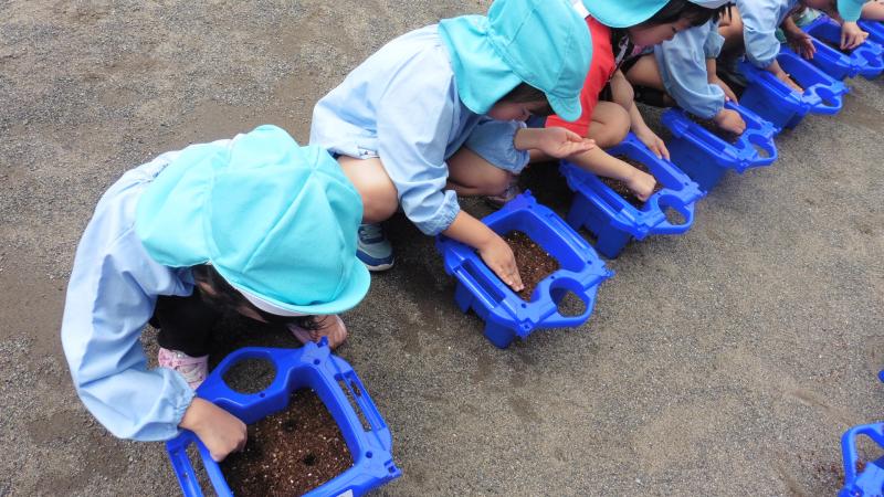 土に穴をあけて、種を置きます。みんな真剣です♡これから毎日お水をあげるよ!!