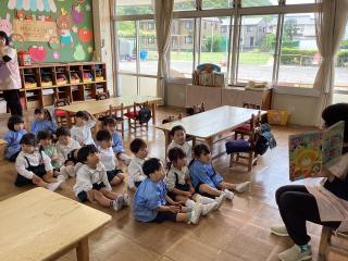 年少さんは「シール遊び」、年中さんは「絵本 キンダーブック」年長さんは「絵本 かんがえる」を読みました。みんな楽しく臨んでいます。
