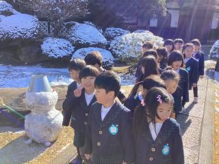 2/9涅槃会が行われた日。前日のお休み中に梅花幼稚園がある沼津市にもなんと!大雪が降りました☆涅槃会で行った霊山寺の境内や、幼稚園の芝生広場、子ども菜園にも雪が降り積もって残っていて、なかなか目の当たりにすることがない光景に大興奮の子どもたちでした(*^^*)年長さんは数日前から準備していた氷が出来ている様子を小さなお友達に見せてくれている様子に優しさを感じました♪雪だるまを作ったり、冷たい雪や氷に触れることで貴重でワクワクの体験となりました(*^^*)