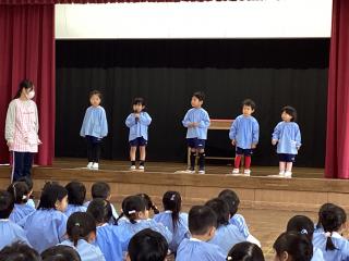 おゆうぎ会で発表する歌や合奏の練習も仕上げに入ってきました。年長さんは年少さんやひよこさんをお客さんにお招きし、劇を見せてあげていました。かっこいい年長さんの劇を見て、みんなにこにこでした。年長さんもたくさん拍手をもらってうれしそうでした。
