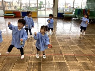 年中さん、年長さんは衣装を合わせて、おゆうぎや劇の練習をやっていました。年少さんは元気よく合奏や歌の練習をしていました。ひよこ組さんは、折り紙を折っておうちを作りっていました。みんななかよくやっていました。