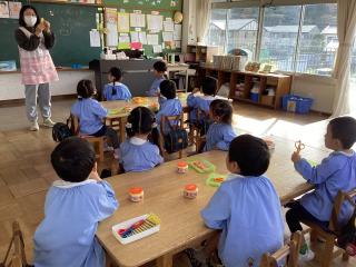 年中さんがおゆうぎ室で合奏とおゆうぎの練習をしていました。いよいよ本番の週を迎えました。仕上げの練習を頑張っています。