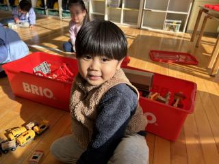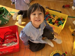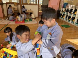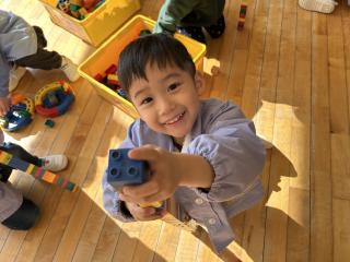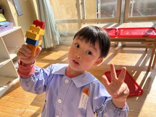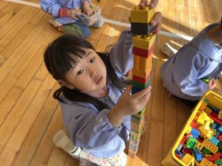 ブロックの崩れる音と「あ~!もう一回!」の声が響いています。みんなの背を超える程積み上げ、新記録に挑戦中です!
