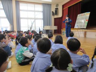 今日は幼稚園に西警察署の交通指導員さんをお招きして交通安全教室を行いました。