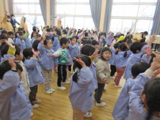 雨天だったためお遊戯室で講和を聞いた後、もも組さんはビデオを視聴し、さくら組さんは遊戯室内で歩行練習、ふじ組さんは傘を使った歩行練習を行いました。