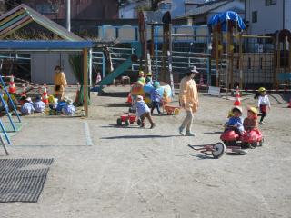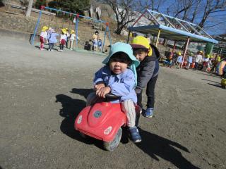 ペアを作っていざ園庭へ!一緒に車を押して遊ぶ子、車に乗ったうめ組さんを押してくれるさくら組さん、大きなお山を作ったり、走り回るうめ組さんをさくら組さんが追いかけてくれたり…。とっても心温まる可愛らしい姿がたくさんありました(*^_^*)