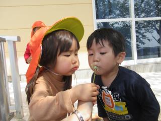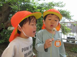 また、先日遊戯室の南側で遊んでいるとたんぽぽの綿毛を発見!口をいっぱいに膨らませて「フーッ!!」と吹き飛ばす可愛い子どもたちの姿も掲載させていただきますね♡