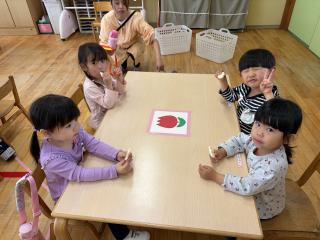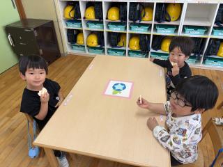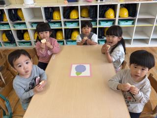 今日はすスペシャルなおやつ(ぱりんこ)があるよ!と伝えると、「ええ!!やったー!!」と目を輝かせてくれたもも3組さん♡みんなで「美味しいね♪」とお話をしながら美味しく食べました!