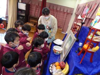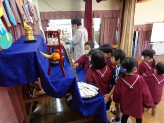 成道会 年長さんが、献花献香献水をしました。 落ち着いて上手にできました。 お坊さん先生のお話を聞きました。 お経をあげて下さり、みんなでお参りしました。 みんなが幸せに過ごせるように、いつも見守って下さるお釈迦様。 ありがとうの気持ちを忘れずに、生活していきましょう。