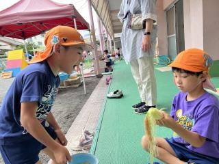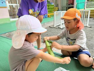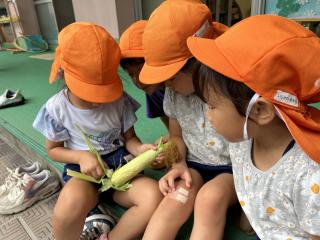 毎日「僕たちより大きくなった!」「トウモロコシの毛が伸びてきたね」と観察をしていた子どもたち。『これもう収穫できるよっ!』と大喜びでした!