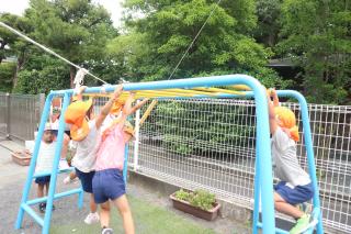 三角積木や遊具を見立てて、『竹組レスキュー隊の訓練』で沢山身体を動かしたり、