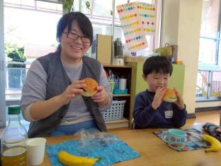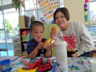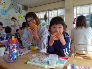 いつも食べている給食を今日はお家の人と一緒に食べることができてとっても嬉しそうです!
