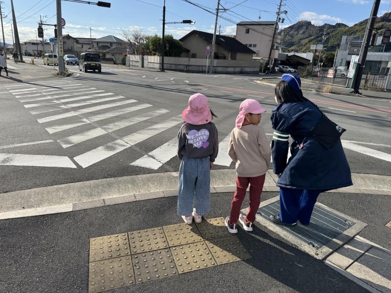 園の近くの交差点で実際に安全な渡り方を交通安全指導員さんに教わったり、雨の日の傘の扱い方を教わったりしました。