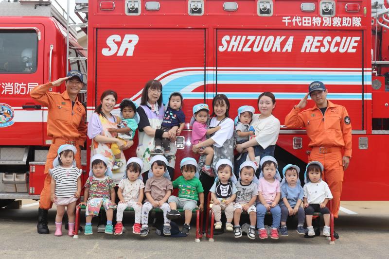 7/2(水)、静岡市消防署の方が園に来てくれ、花火教室を行いました。正しい花火のやり方を教わり、緊張しながらも実際に花火を持ち、終わった後もしっかりとバケツに張ったお水の中に花火を入れる子どもたちでした。花火教室が終わってからは消防車見学!色々な特殊装備の説明を聞いたり、運転席に座らせてもらったりとたくさん楽しんだ子どもたちでした。静岡市消防署の皆様、暑い中ありがとうございました。