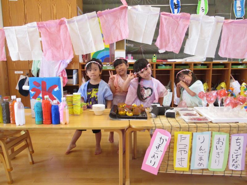 先日秋まつりがありましたが、お祭りの興奮冷めやらぬすみれ組のおともだち、自分たちでお祭りを企画し、園のおともだちに遊びに来てもらいました。工夫を凝らしたゲームや食べ物まで色々と製作して他のクラスのおともだちをもてなしていました。