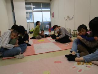 まず最初に、『バスに乗って』の親子ふれあい遊びをしました。お子さんはおかあさんの膝に乗って右や左に曲がったり、坂道やガタゴト道を通ったりととっても楽しそうにバスに揺られていました。